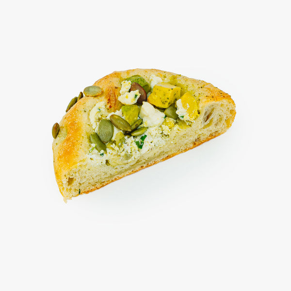 バジル風味のパンドミ生地に、フランスでは定番のシブレットとチーズを合わせ、アボカドとパンプキンシードをのせました。