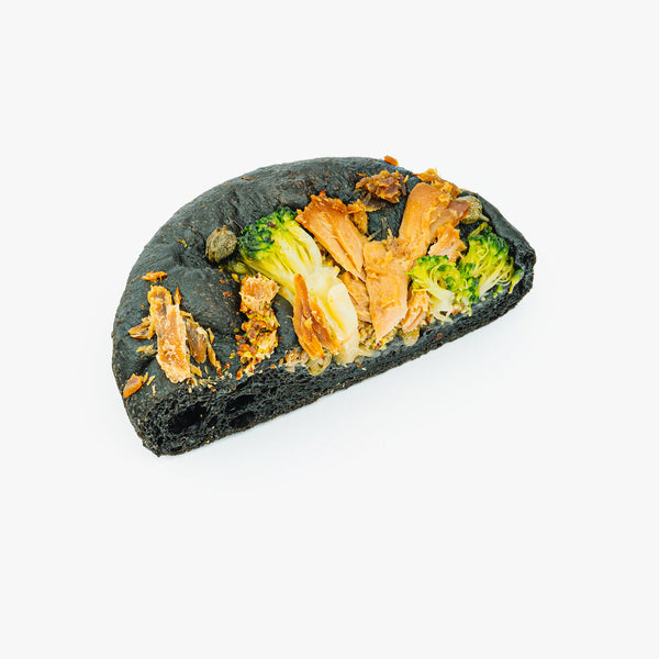 Pain à l’encre de seiche au thon, câpres et brocoli